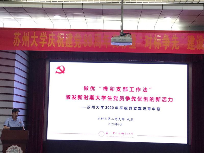 七一前夕,本科生第二党支部书记成龙在苏州庆祝建党99周年表彰暨“对标争先”建设评审会上,以《做优“榫卯支部工作法” 激发新时期大学生党员争先优创的新活力》为主题汇报了本科生第二党支部将专业特色融入党建工作,充分发挥“榫卯支部工作法”契合度准、咬合力强、实用性高、精益求精等特点,在思想引领、组织建设、品牌建设、作用发挥等方面积累的工作基础,并从“学、思、践、悟”四个方面介绍了“创优提升党支部,激发党员争先创优的活力,充分发挥支部和党员先锋模范作用”的分阶段创建思路和预期成果。