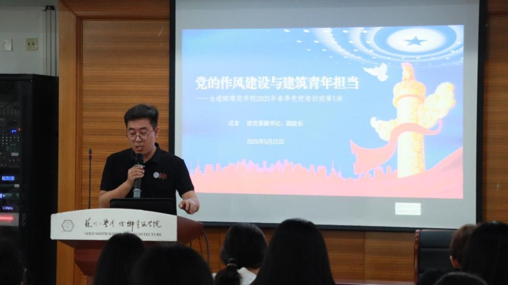 接下来,成龙老师以“党的作风建设与建筑青年担当”为题,从中央八项规定精神的时代意义、作风建设的历史传承、作风建设的三重维度、学生党员作风建设的“五维实践法”四个方面,开展学院2025年春季党校培训第1讲。在授课过程中,成老师指出,作风建设关乎党的形象与生死存亡,青年党员是党的未来,作风养成关键期要扣好“第一粒扣子”。他强调学员需要以初心砥砺匠心,用真理的光芒照亮设计初心,保持党的优良作风基因,在设计中不断精益求精,成为服务师生的“空间设计师”,坚持“亲民爱民、艰苦奋斗、科学求实、迎难而上、无私奉献”的焦裕禄精神,不断发展巩固群众基础。成老师告诫学员群众路线是党的生命线和根本工作路线,学员们应当成为同学的“镜子”和“树洞”,做好榜样和烦心事、忧心事的倾听者,有问题第一时间反馈,起到上传下达的桥梁作用,以好的党风、作风推动优良学风、院风的建设。最后,成老师从思想筑基、学风求真、服务暖心、纪律立规、实践赋能五大维度,鼓励青年在“社会大地”上绘制青春画卷。