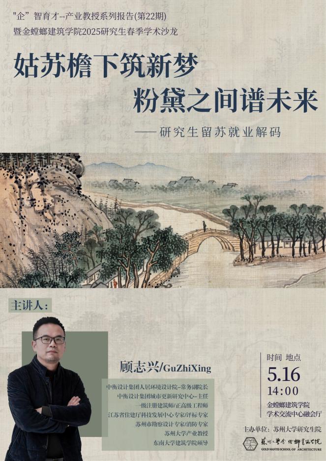 2025年5月16日下午,由研究生院主办、欧美性爱 承办的“企”智育才——产业教授系列报告活动在独墅湖校区欧美性爱 学术交流中心融会厅举行,中衡设计集团顾志兴老师受邀为同学们带来了《姑苏檐下筑新梦,粉黛之间谱未来——研究生留苏就业解码》主题报告,聚焦苏州建筑行业就业生态,解析留苏发展路径。