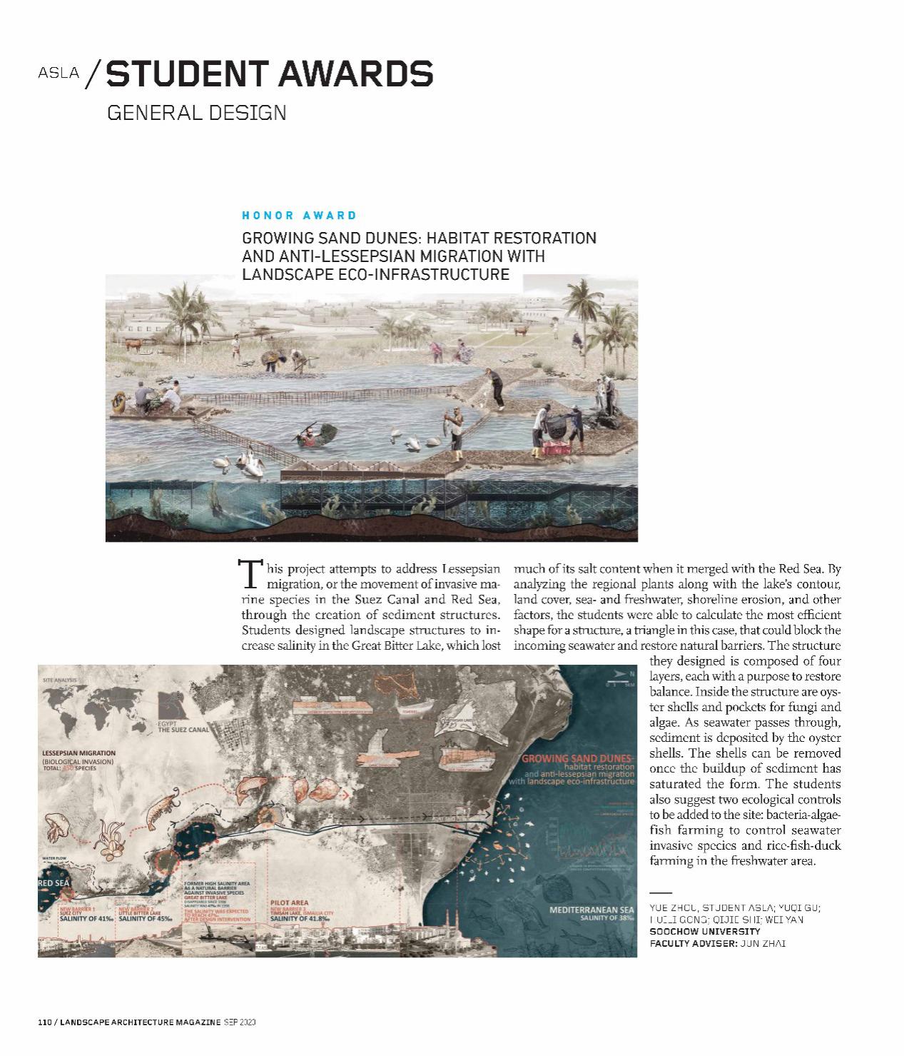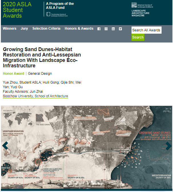 9月4日,由美国景观设计师学会(American Society of Landscape Architects,后简称ASLA)主办的2020 ASLA学生奖结果已公布,欧美性爱 风景园林系翟俊教授指导的,由周悦、顾语琪、龚惠莉、史琦洁和闫薇同学共同完成的作品“生长的沙堆——通过景观生态基础设施恢复生境和反生物入侵”(Growing Sand Dunes-Habitat Restoration and Anti-Lessepsian Migration With Landscape Eco-Infrastructure)获得了含金量最高的“综合设计类”的荣耀奖,并登上了今年美国景观设计师学会的官网和杂志。