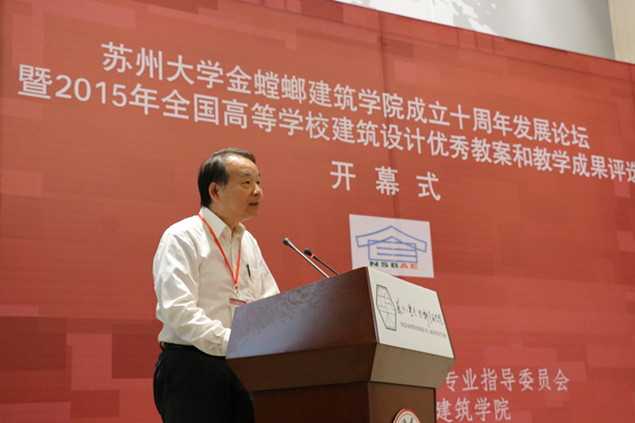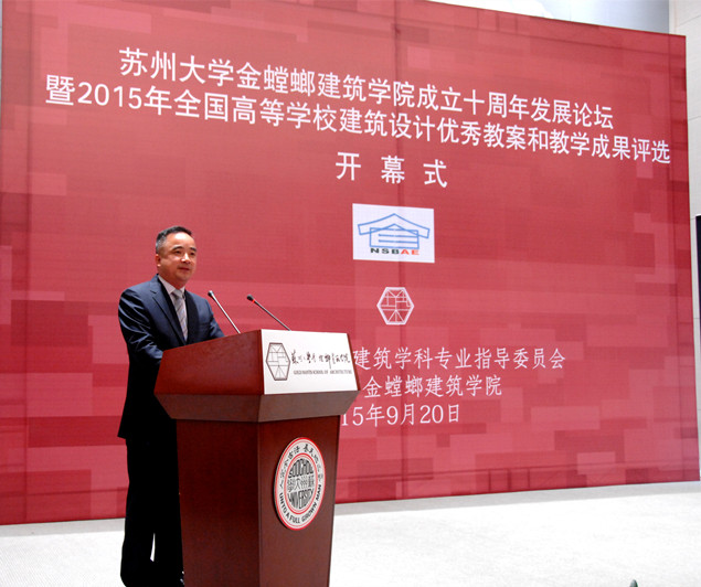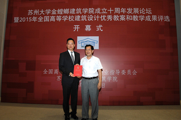 院庆10周年之际,学院承办了2015年全国高等学校建筑设计优秀教案和教学成果评选和展示活动。主办单位、全国高等学校建筑学学科专业指导委员会主任、东南大学城市规划设计研究院院长王建国教授在讲话中肯定了学院周到、细致的筹备工作,鼓励学院在香山帮精神和匠心筑品的院训指引下更快、更好地发展。
