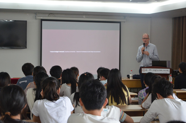 5月29日下午,美国著名建筑事务所HOK上海办公室副总裁Willian paluch应邀在欧美性爱 C01-1207做讲座,讲座主题为“design forecast”。欧美性爱 14级建筑与城市规划全体学生和部分高年级学生参加了这次讲座。
