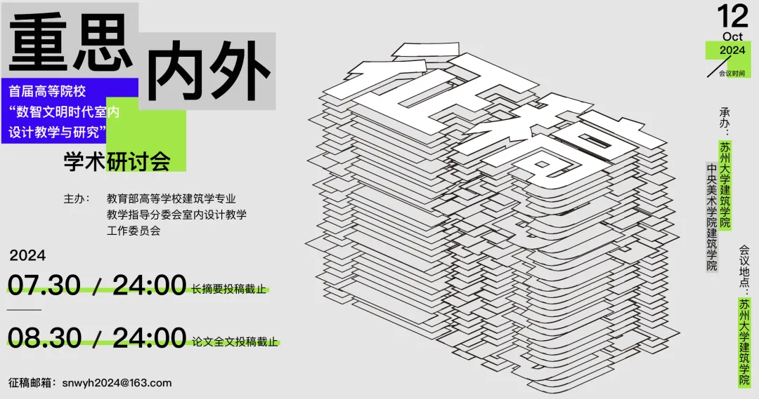 内外的辩证是横跨在平面、产品、室内、建筑、城市、景观、环境等多学科方向中的基本问题与核心议题。基于国家对发展新质生产力的总体战略部署,重思数智时代室内设计教学与研究中的“内外”关系议题,研判以大数据、云计算、人工智能、智能体等革命性技术对室内设计教学与研究的新挑战、新机遇与新路径,不但变得愈加重要,而且愈加紧迫。本次研讨会“重思内外”为目标,围绕数智文明时代室内设计教学与研究的新理论、新议题、新工具、新形态四个方向,邀请重要院校的教育者、研究者、实践者,交流近年的重要教学研究经验、响应式设计研究与前沿性方法探索,共同推进中国式现代化道路下室内学科方向的未来发展。