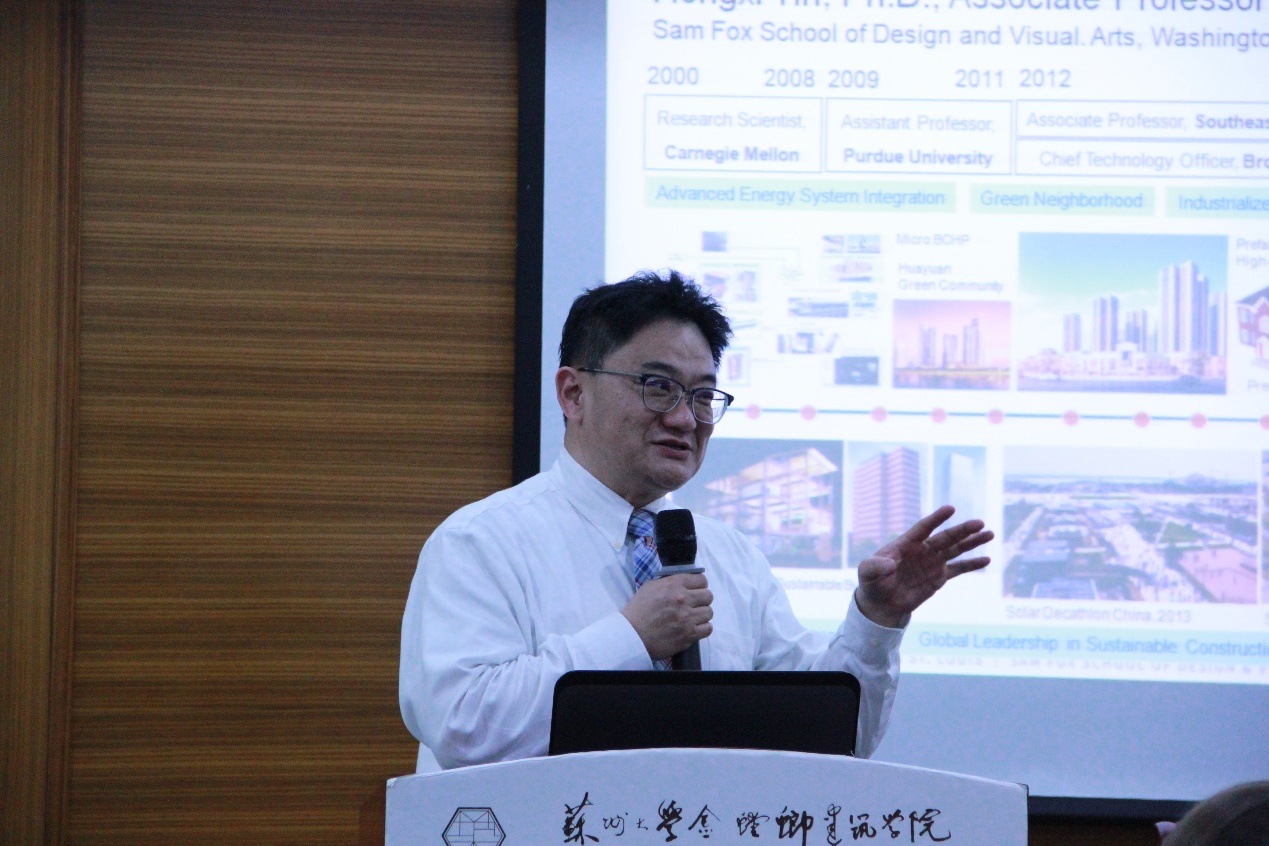 晚上,Anna Marie和Hongxi Yin为学院师生作了题为“华盛顿大学建筑教育的前沿”讲座。现场,Anna Marie向与会师生介绍了圣路易斯华盛顿大学建筑学院的学院概况、学科和专业介绍、学制、优秀导师、奖助体系政策以及毕业生就业等方面的信息,并欢迎有意愿的学生积极申请该校的本科交流项目和研究生项目。Hongxi Yin向师生们详细介绍了华大的设计课程体系以及华大曾做过的三个太阳能十项全能竞赛项目。建院学生们纷纷表示,通过此次交流,他们对圣路易斯华盛顿大学有了更加全面和深入的了解,对未来留学规划有了更加清晰的认识。