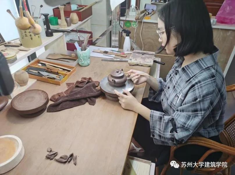 通过熟人介绍,她找到了一位紫砂手艺人,师从江氏流派,家族中也多为紫砂工艺大师。实践队员采用访谈的实践形式,通过采访手艺人的日常工作和生活,了解到紫砂手艺人在紫砂器上凝聚的心血,无论是手法、原料的质量、烧制的火候亦或者是周围的环境,乃至作画题字,都是精益求精,一步错则步步错,一步不到位则终不成器。在采访过程中,手工艺人向她介绍,这种工艺以手工拍打泥片、拼镶组合成型为特色,传承着人类长达万年的手工制陶工艺,并催生出了丰富多彩而又独特的紫砂文化。她了解到“紫砂”便是一种产生和发展于她家乡的手工制陶工艺,亦是水、火士的艺术。