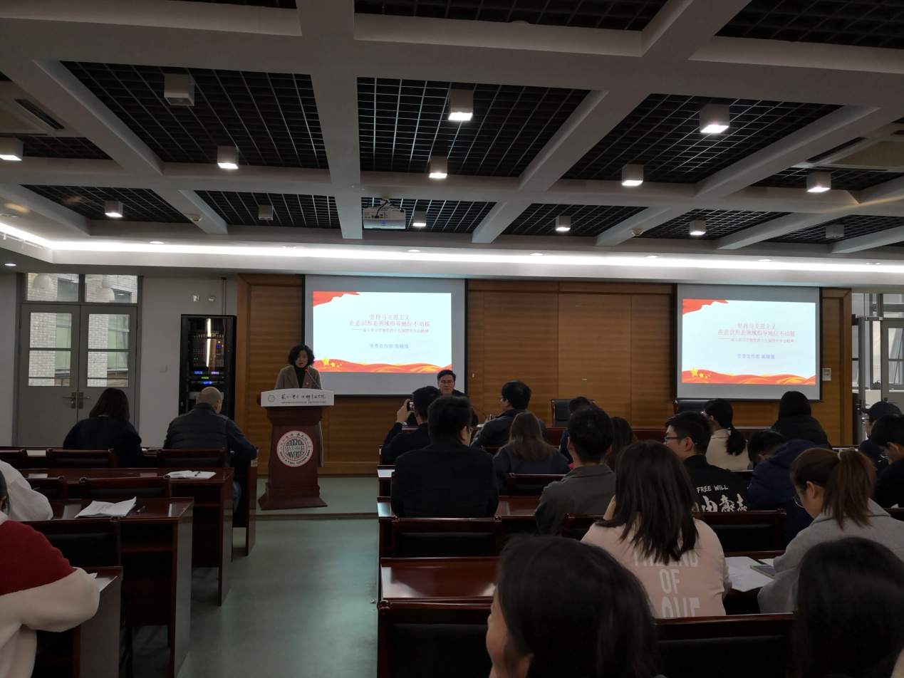 接着陈部长就如何在学校工作中结合实际情况进行深化学习、贯彻落实提出要求:一是将坚持马克思主义在意识形态领域的指导地位融入办学的全过程全方位;二是坚持将以社会主义核心价值观引领文化建设制度融入高校思想政治工作和校园文化建设的全过程全方位;三是坚持将完善正确向导的舆论引导工作机制融入加强和改进高校宣传思想工作的全过程全方位。陈部长就时事热点问题,学校管理中的实际问题,如何加强制度建设,完善制度体系,牢牢掌握意识形态工作领导权进行阐述,从理论武装、阵地建设、新闻舆论管理、队伍建设、意识形态工作责任、其他的规定条例等六个方面回答如何开展好组织好高校工作。陈部长的辅导报告信息量大,案例鲜活,数据详实,内涵丰富,既有现实与历史的对比,又有国内与国外的比较,更有理论与实践的统一,赢得了师生党员多次的热烈掌声。