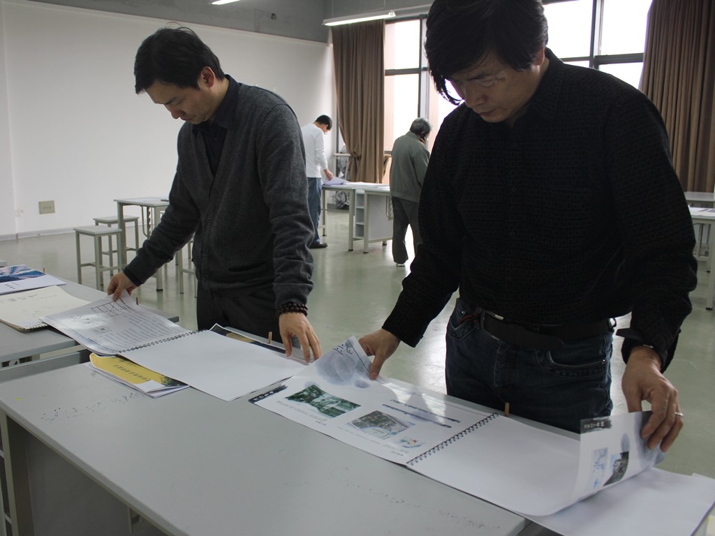 艺术学院王泽猛教授,苏州工艺美院平国安教授,苏州科技学院董志国老师齐聚参赛作品展览室,对第一阶段的40多份参赛作品进行点评,一起探讨了参赛作品的评分方法与各阶段比分权重。5位评委一致认为,本次参赛作品总体水平较高,选手们都认真进行了实地考察,参阅国内外文献,在指导老师的帮助下进行了较为科学、合理的分析,部分作品还融入了比较好的人文观念与设计理念,涌现出一大批让人眼前一亮的优秀作品;但评委老师同时也指出了部分作品的不足之处,希望可以在后期的设计中进行一些作品完善,创新设计理念,深入挖掘设计背后的东西。