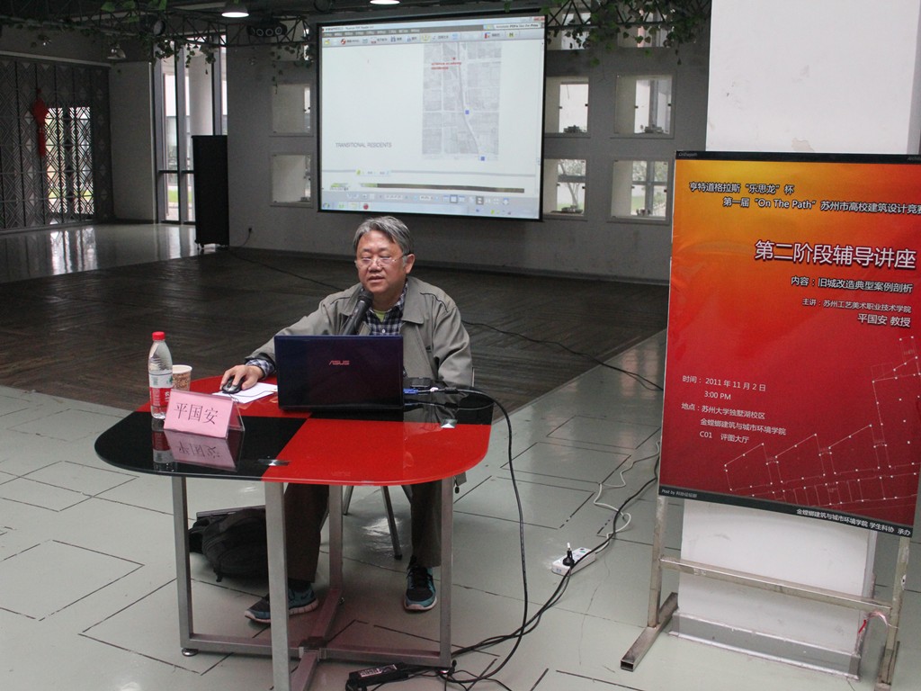 评审会议结束后,苏州工艺美术职业技术学院平国安教授为参赛选手做了一场题为“国内外旧城改造典型案例分析”的讲座,为同学们第二阶段的作品创作进行辅导并提供借鉴。平国安教授首先用他参与的“苏州泰伯庙改造的课题项目”为例,给大家展示了泰伯庙课题的调研照片,详细讲解了整个课题的设计思路与设计过程。通过课题的成果展示,平教授鼓励同学们从调研中学会分析、思考,学会寻找灵感、演绎自己的设计思路,并将所学的东西灵活运用到接下来的比赛作品或者学习中去。随后,平教授又引用了一组清华美院与美国麻省理工大学2004年的课题给大家进行对比展示,课题中深入详细的分析、合理到位的规划、精美震撼的设计成果让在坐的同学深深折服,使他们在学习的同时也认识到了彼此间的差距,拥有了前进追赶的动力。最后,讲座在热烈的掌声中结束。同学们表示通过今天的讲座学到了许多关于本次竞赛所需要的知识,并会针对平教授讲座中指出的注意点,总结第一阶段作品中的不足来不断完善和改进接下来的比赛作品。
