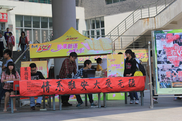 募捐地点分别设在一期、二期的食堂楼下。两天里,充满爱心的大学生们纷纷前来捐钱捐物。有的同学拎着大袋的衣物来进行捐助;有的来询问灾区最急缺物品的种类,并特意从超市买回进行捐赠;有的同学在两天内多次捐助。许多同学都不愿意留下自己的姓名,只希望用自己的绵薄之力,为灾区的人民做一点力所能及的事。诸如此类的细节无不感动着在场的工作人员,看到堆积如山的物资,感动和温暖便纷纷涌上心头。