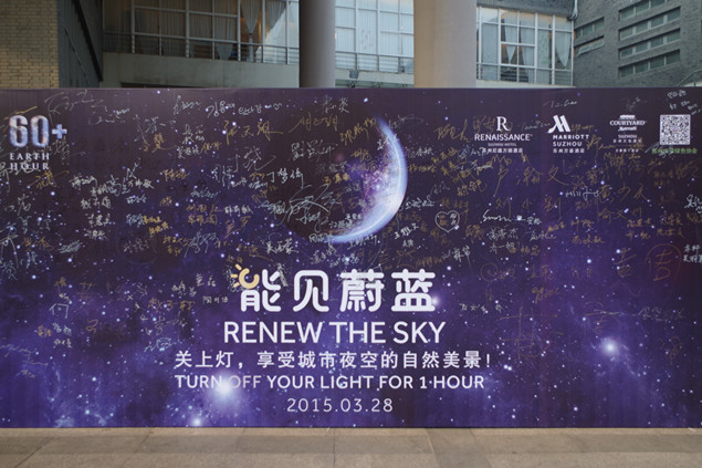 “地球一小时”是世界自然基金会在2007年发出的一项倡议:呼吁个人、社区、企业和政府在每年3月23日熄灯1小时,以此来激发人们对保护地球的责任感。今年,为了呼应当前苏州最急迫、最受关注的环境议题——雾霾,传递环保正能量,欧美性爱 绿色协会携手苏州万豪酒店联盟开展“能见蔚蓝”地球一小时系列活动,通过地铁快闪,环保骑行,校园不插电演唱会,呼吁市民和学生“关爱地球,解放苍穹”。