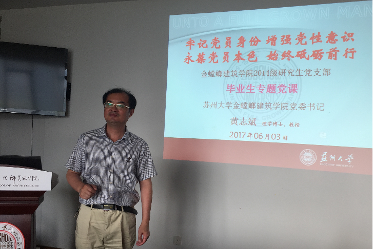 6月3日晚上7点,学院党委书记黄志斌在学院五楼会议室为2014级研究生党支部全体毕业生党员上了题为《牢记党员身份,增强党性意识,永葆党员本色,始终砥砺前行》的专题党课。黄志斌从学校对毕业生党员的相关要求,“两学一做”学习教育常态化、制度化、长效化,认真学习《中国共产党章程》、《中国共产党廉洁自律准则》、《中国共产党纪律处分条例》等党章党纪党规,着重要求毕业生党员们要向《中国共产党廉洁自律准则》所倡导的道德高线看齐,通过学习真正将党纪党规学好学透,时刻牢记党纪党规,做一个有党性、有良心、有定力的党员,在日常工作中积极发挥党员的先锋模范作用和表率作用,依法依规做好各项工作。要始终牢记党员身份,增强党性意识,永葆党员本色,不忘初心,砥砺前行。要进一步增强政治意识、大局意识、核心意识、看齐意识。切实成为讲政治、有信念,讲规矩、有纪律,讲道德、有品行,讲奉献、有作为的“四讲四有”合格党员,不断为“党员身份”增添新的荣誉光辉。