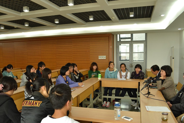 随后,退休老干部夏红珍老师就个人工作和生活中的经历,为同学们进行了经验上的交流。1999年退休后,夏红珍老师并没有停止她对教师这份职业的热爱,又继续在苏州农学院担任班主任。在闲暇之余,夏红珍老师还参加了老年大学,学习了昆剧,更是与时俱进选择QQ与她的学生们进行联系和交流。在多年与学生接触的过程中,她近距离地发现了很多现代大学中存在的学风不正、教学浮躁等问题。她和同学们分享了两首诗歌《七苦歌》、《苔》,指出“人从“苦苦”坠地便开始了一生吃苦的过程,人的一生应当勤勤恳恳”,教导同学们不要被浮躁的社会风气影响,应以踏实严谨的态度刻苦学习,拓宽知识面。在朗读一封1991年学生寄给她的信时,夏老师通过信中学生对她工作的评价,展现自身对教师这份职业的态度,“我只是平凡的教师,本职就是成为我学生的良师益友,拥有爱心和责任心”。夏红珍老师以一句人生感悟作结,“工作中美丽,学习中快乐”,希望同学们学习和生活更进一步。