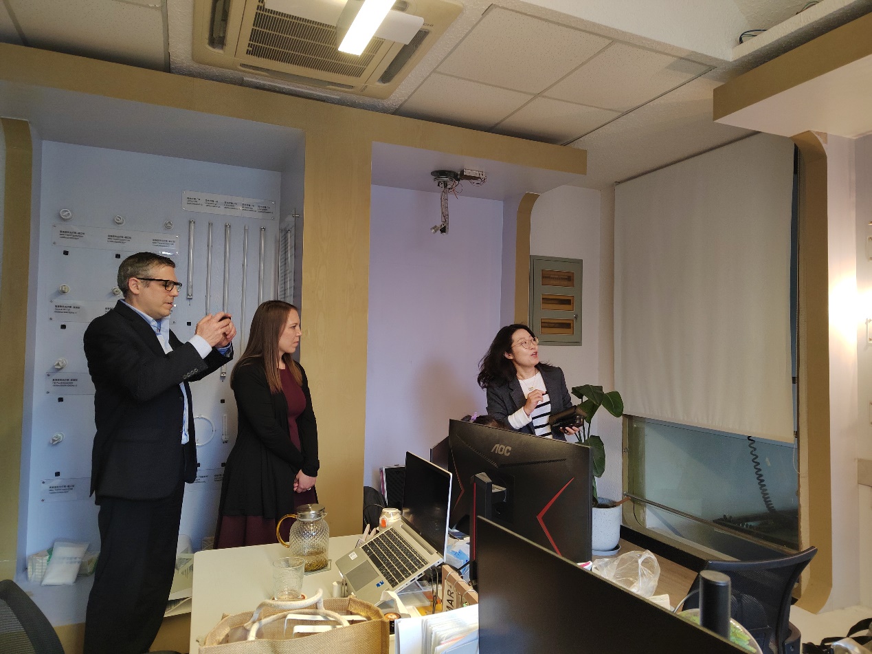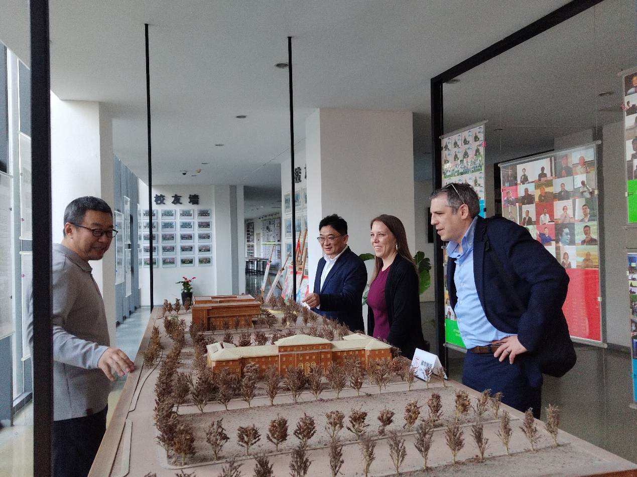 访问团一行在申绍杰等老师的陪同下,参观了学院的教学设施、实验室、“一带一路”联合实验室以及学生作品展示区。在参观过程中,Anna Marie和Hongxi Yin对学院的硬件设施和教学质量表示高度赞赏,并认为双方在人才培养、国际交流和国际太阳能联合竞赛等方面有着广阔的合作空间。
