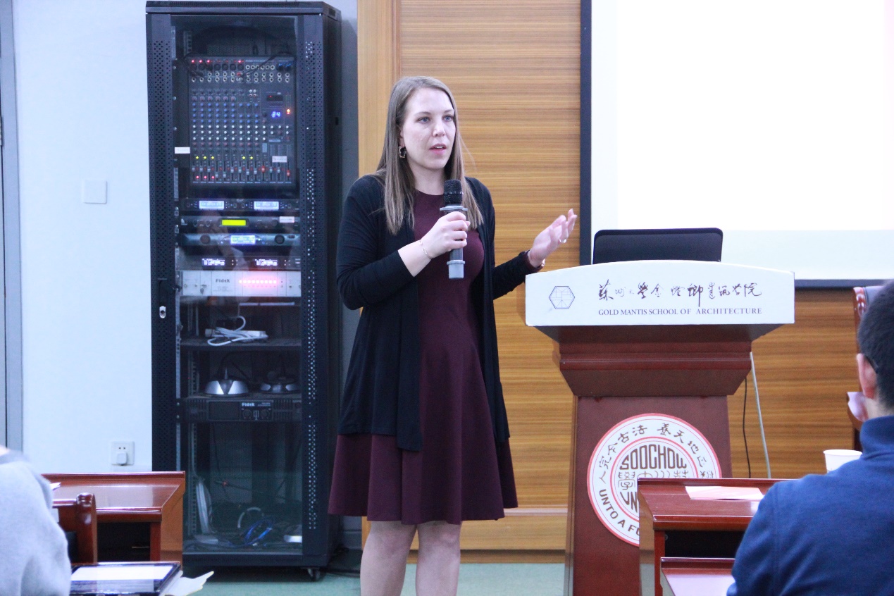 晚上,Anna Marie和Hongxi Yin为学院师生作了题为“华盛顿大学建筑教育的前沿”讲座。现场,Anna Marie向与会师生介绍了圣路易斯华盛顿大学建筑学院的学院概况、学科和专业介绍、学制、优秀导师、奖助体系政策以及毕业生就业等方面的信息,并欢迎有意愿的学生积极申请该校的本科交流项目和研究生项目。Hongxi Yin向师生们详细介绍了华大的设计课程体系以及华大曾做过的三个太阳能十项全能竞赛项目。建院学生们纷纷表示,通过此次交流,他们对圣路易斯华盛顿大学有了更加全面和深入的了解,对未来留学规划有了更加清晰的认识。