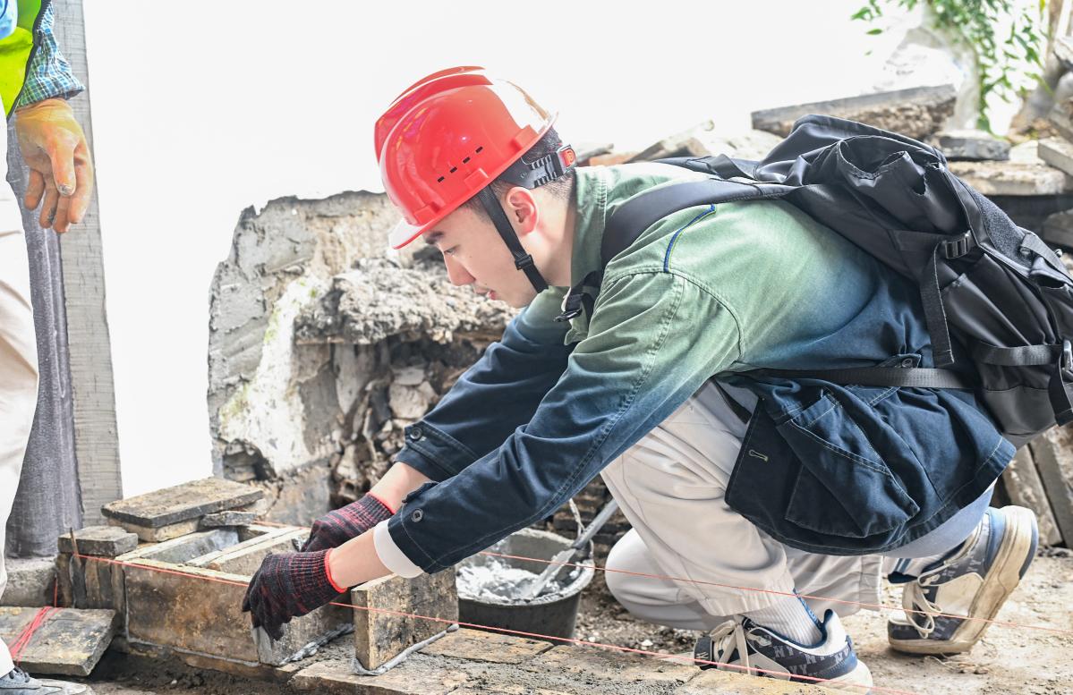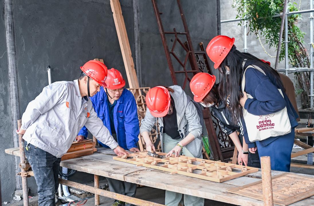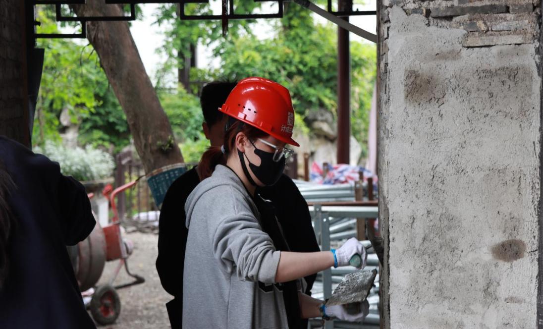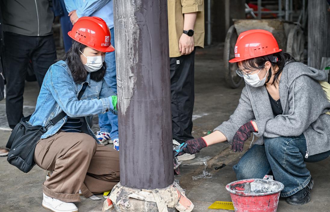在修缮工地,文物修缮专家边走边讲,介绍鹤园的建筑特点、建筑保存情况、以及修缮的相关施工工艺、技术、具体传统做法等。学生跟随现场工匠学习各类修缮做法,他们爬上脚手架,体验檐口部位窝瓦推瓦等工艺,分组体验抹灰粉墙、油漆、砖墙砌筑等,亲眼见证古建由破败到焕新的“神奇”,让学生实现从理论到实践的转变。