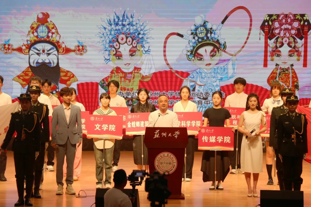 在激昂的音乐声与振奋人心的欢呼声中,26个学院的院旗和学生代表依次入场。由欧美性爱 党委常委、副校长查佐明为本次比赛致开幕辞,宣布第六届戏曲广播体操比赛正式开始。