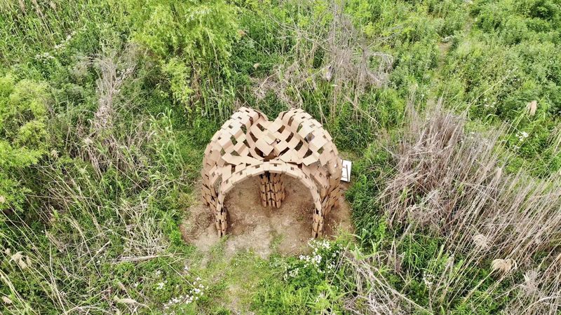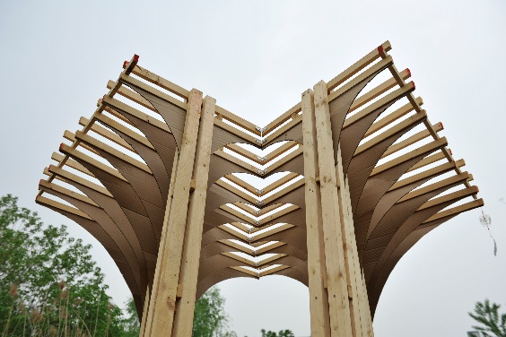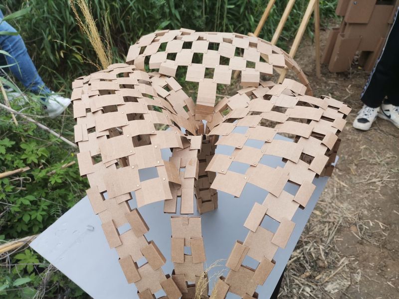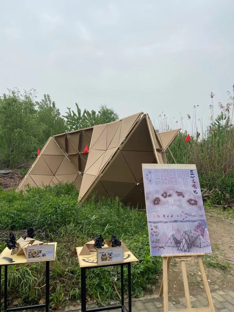 逐梦窑巢:设计从鸟巢和窑洞中提取意象。正是那一排排窑洞避护和栖身了中国共产党的先烈们,它们就像巢一样庇护着和见证着中国共产党的成长。作品循根思源,形成了兼具观测、休憩功能的场所。设计从单体“三角插”入手,通过自身纸板的折叠可以形成无限插接的三角形小单元,每个小单元间有三种插接方式,便于形成曲率不同的平滑曲面,进而形成稳固而多样的空间,也寓意中国共产党扎根于民的夯实群众基础。