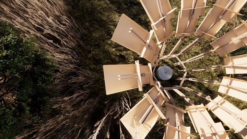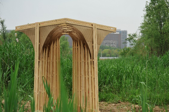 归巢:建筑主体是一个亭子,上面放射呈伞状,象征着中国共产党永远甘做人民的保护伞。“伞”的开合设计寓意中国共产党全心全意为人民服务,也暗喻中国共产党一路走来的艰辛与不易。整个建筑又像一把火炬,“星星之火,可以燎原”,伫立在芦苇荡之中,如同中国共产党高举手中火炬,于九原板荡之际跋涉,星火终成燎原之势,照亮了黑暗混沌之中的中华民族。