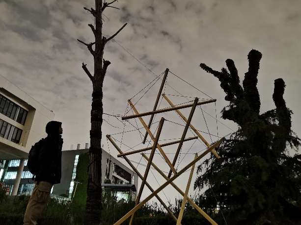 星垒:设计由多个六面体连接构成,每五个六面体组成一个五角星。五星红旗是中国国旗,五星代表着中国共产党领导下的人民大团结。“星垒”将红五星的元素融入到作品设计中来,以此致敬建党百年。透过阳光,堡垒中的五角星在地面形成的一个个投影,象征着为实现中华民族伟大复兴而艰苦奋斗、开拓进取的中国共产党人的伟大精神已经深深投进了亿万华夏子女的心中。