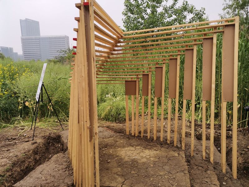晨碑:华夏千年,党筑百年。百年之前我泱泱中华历尽沧桑与磨难,但在中国共产党的领导下终迎来涅槃,中国正在实现伟大民族复兴的道路上不断前行,走向更光明的未来。本设计采用叠涩的形式建造,上升的阶梯象征着在中国共产党领导下的中国正一步步迈向新征程,而夯土而成的坚固地基和稳固阶梯更启示我们在通向中华民族伟大复兴征程中我们仍要脚踏实地,一步一个脚印,方能迈向更加光明的未来。