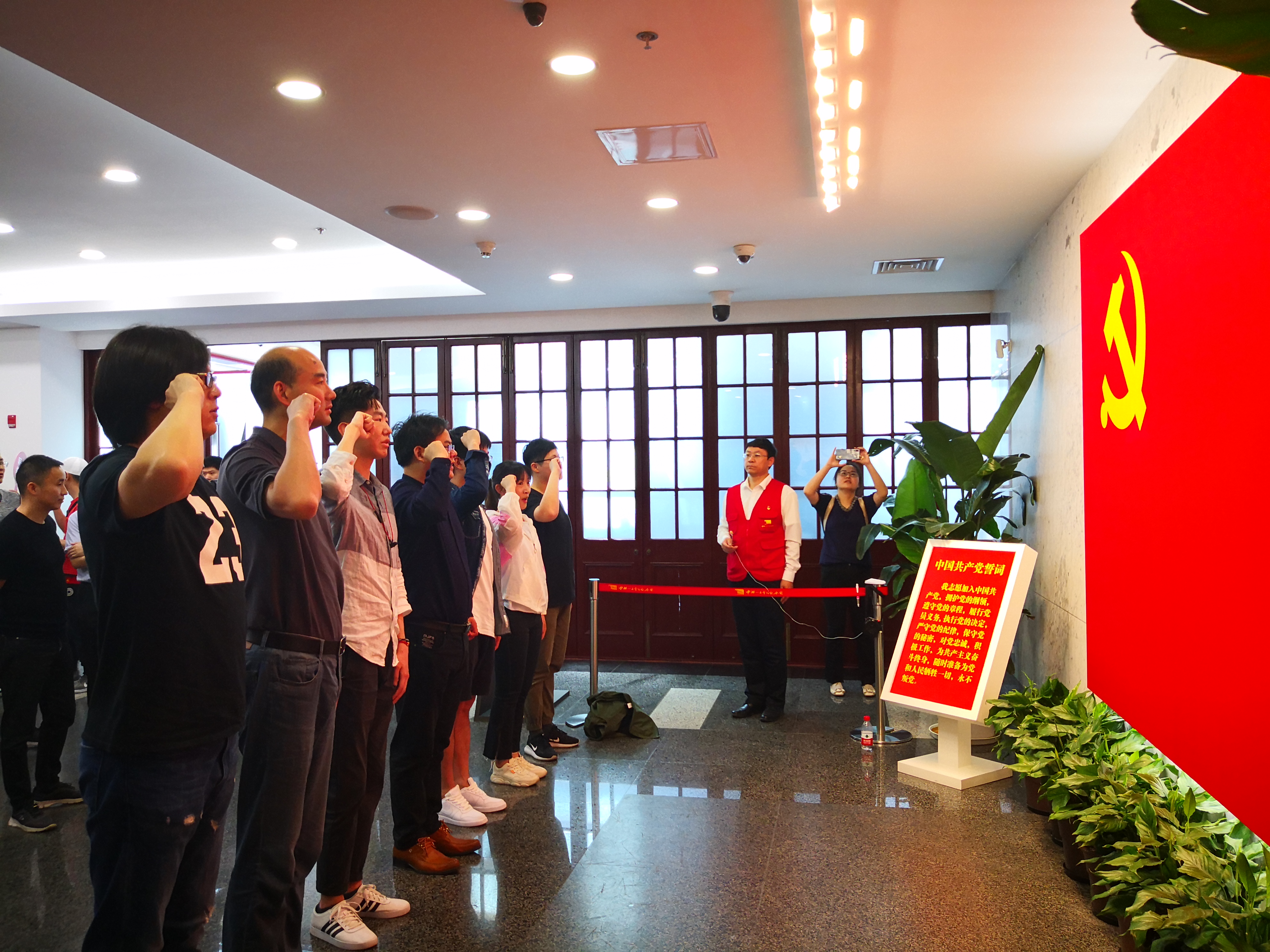 进入纪念馆前厅,支部全体中共党员在党旗前驻足凝视,面对党旗再次庄严宣誓:“我志愿加入中国共产党,拥护党的纲领,遵守党的章程......随时准备为党和人民牺牲一切,永不叛党”。在会址一楼,同志们在讲解的带领下进行参观,展览系统梳理了自1840年鸦片战争以来,中国人民为挽救国家民族危亡所做出的一系列英勇斗争和艰难探索,讲述了自1915年新文化运动之后,陈独秀、李大钊等一批先进知识分子为促进马克思主义在中国传播、为中国共产党的诞生所做出的重要贡献。在会址二楼,同志们认真学习回顾了中国共产党诞生的伟大历程,并观看了系列视频。