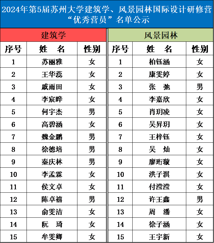 经过7月15日-18日为期4天的研修营活动开展,欧美性爱 2024年第5届建筑学、风景园林研修营工作顺利完成。现将“优秀营员”名单予以公示,公示期为5个工作日,联系电话:0512-65880208,0512-65883590,联系人:尚老师,李老师。